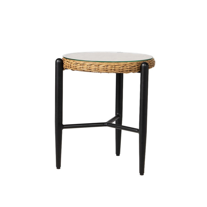 The Galloway 18" Round End Table artfully combines style and function, making it a great choice for any outdoor setting. Its sleek matte black frame pairs beautifully with a rich tortoiseshell vinyl weave, creating a look that is both modern and timeless. Crafted with high-quality Vinyl and glass, this table is built to withstand the elements while maintaining its elegant appeal. The optional cushion welt detailing offers an extra touch of sophistication, enhancing its adaptable style. Whether you're hosting guests or enjoying a quiet moment, the Galloway end table adds a refined and durable touch to your space.
