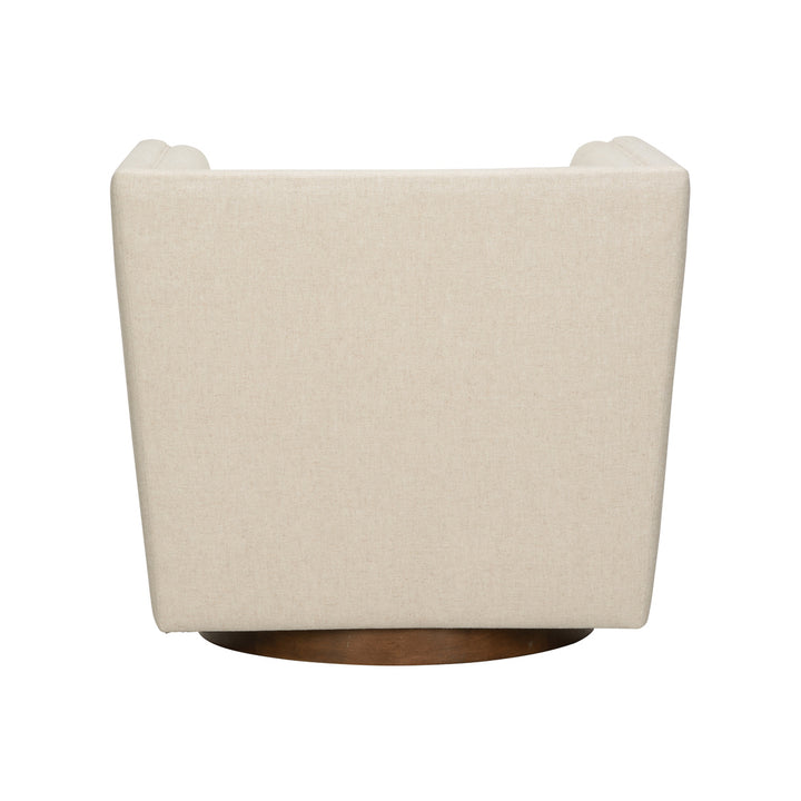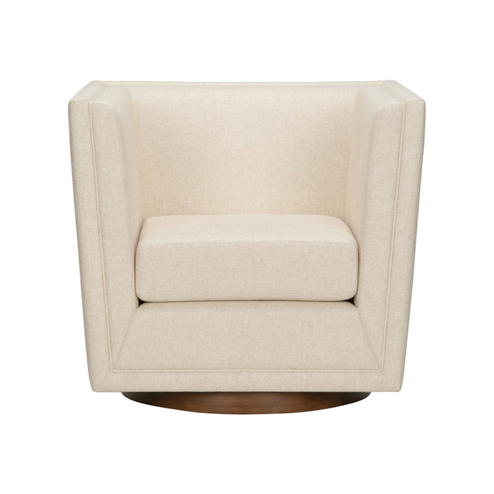 The Gehry Swivel Chair brings comfort and style to any room. Its modern boxy design is enhanced by plush cushions that provide a cozy seating experience. The chair features a wood base and a sturdy 302-grade stainless steel frame with sinuous springs, ensuring durability and longevity. Wrapped in a medium-weight cream fabric, the chair easily fits with various room styles and color schemes. The blend of viscose, polyester, and linen offers a soft and inviting feel. Whether placed in a living room or office, this swivel chair offers both function and elegance, making it a versatile addition to your space.
