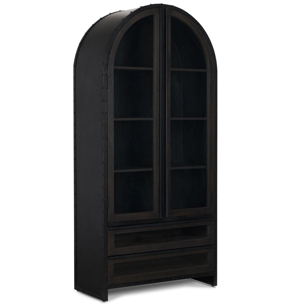 Crafted for those who appreciate both style and functionality, this Bookcase offers a perfect blend of elegance and practicality. The Gehry Wooden Dark Brown Bookcase is designed with an arched top and features two glass-paneled doors, making it a striking addition to any room. Behind these doors, three spacious shelves provide ample storage for displaying dinnerware, accessories, and more. Additionally, the two pull-out drawers at the bottom offer extra space for organizing linens or cutlery. The combination of dark brown and black colors brings a touch of sophistication, while the graphite-toned metal frame with Indian mango wood accents adds warmth and character.