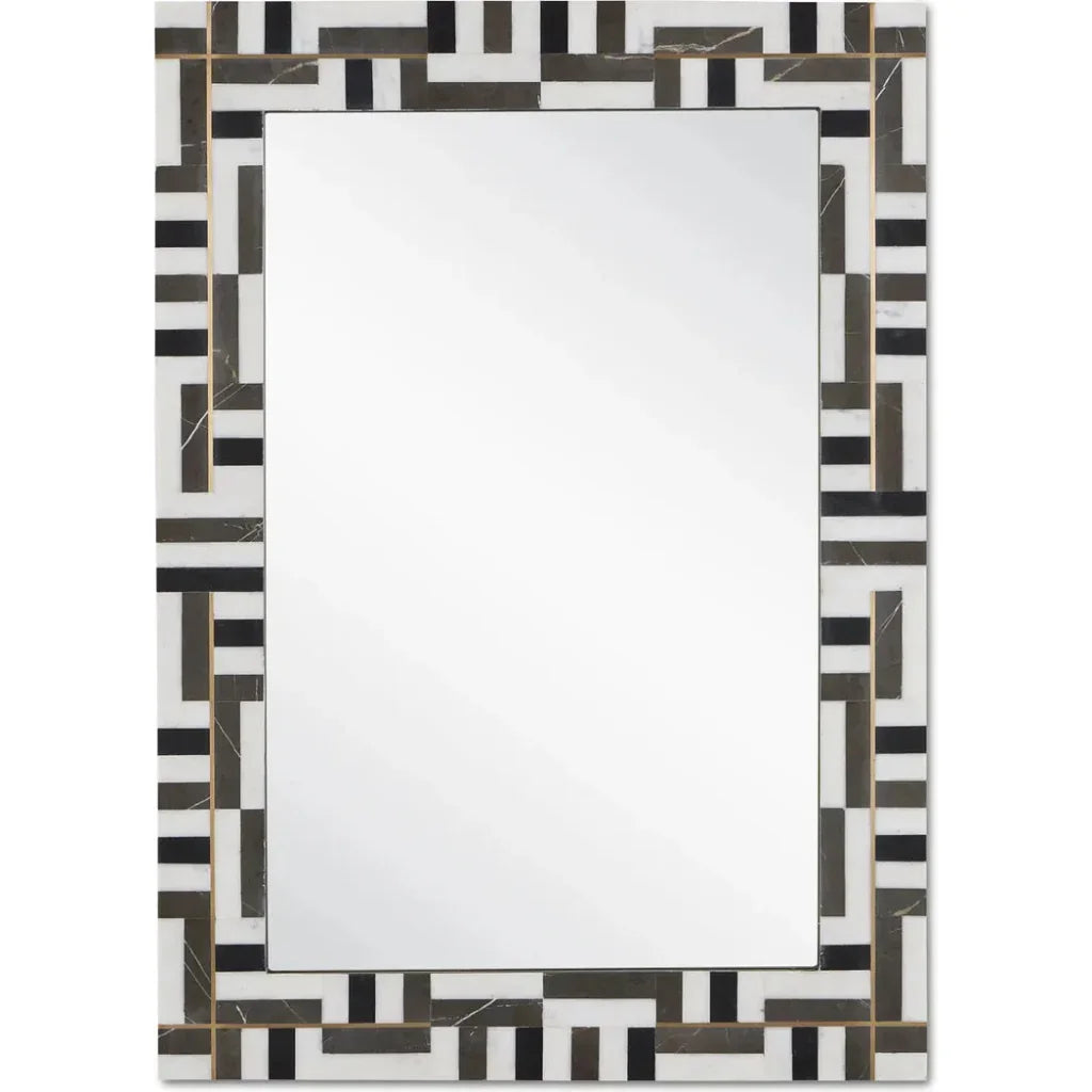 Upgrade your space with the Gentry Rectangular Mirror by Currey Co. Crafted from luxurious Ambaji, Marquina, and Pietra Gray marble, this elegant mirror features a bold geometric pattern and a brass inlay for added opulence. The intersecting design and black inner frame add an extra layer of sophistication to the black and white composition. Hang it vertically or horizontally using the included cleats for a grand and versatile look. The Gentry Rectangular Mirror by Currey Co. is the perfect addition to any space looking to incorporate bold geometric patterns.