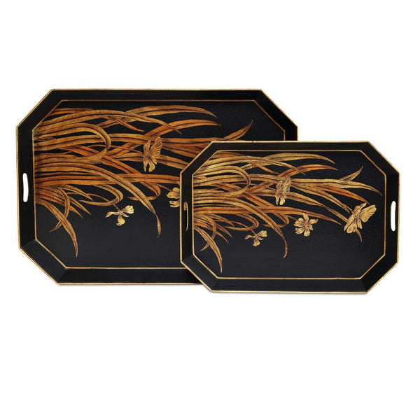 The Glasshouse Tole Tray Set includes one large and one small tray, both crafted from iron. Each tray features a black ground adorned with floral embellishments painted in varying shades of gold. The angled sides are pierced with holes that function as handles, combining decorative detail with practical design. Due to the artisanal finish, the surface of each accessory could differ slightly.