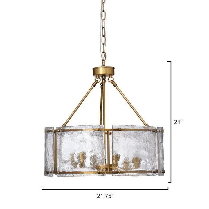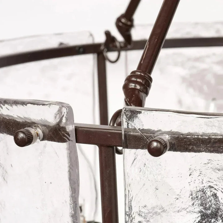The Glenn Large Round Chandelier combines textured glass with refined metal finishes, creating a striking balance of contrast and sophistication. Designed with softly curved ice-like glass that diffuses light into a warm glow, this chandelier is both dramatic and timeless. Available in antique brass or oil-rubbed bronze finishes, each paired with a matching canopy and chain, it enhances dining rooms, entryways, or modern interiors with elegance. Expertly crafted with hand-made frames and glass, the Glenn chandelier offers a harmonious blend of style and craftsmanship.