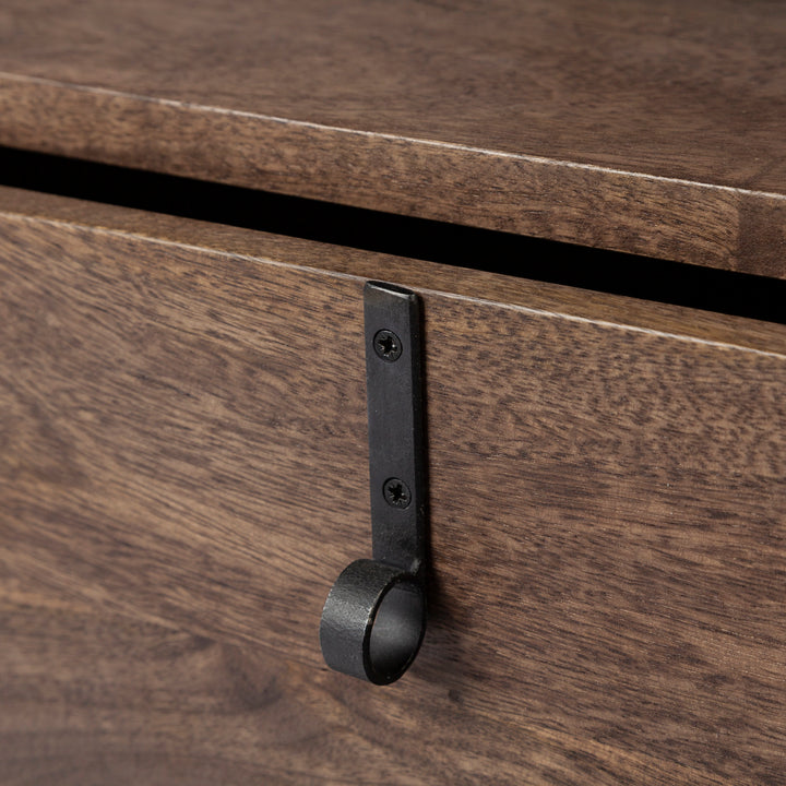 - The wood is smooth textured in a dark brown finish that lets its natural character show through. The iron legs have an unfussy, matte black finish.
