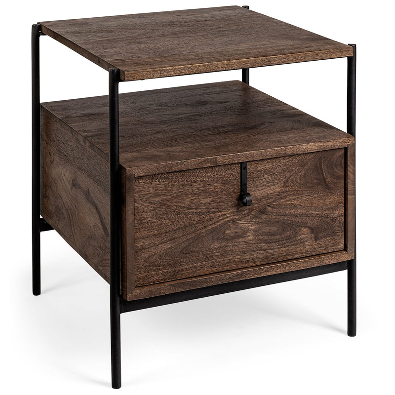 - This modern side table, made from solid Mango wood, comprises a single drawer with a shelf-like top supported by a sturdy, iron frame.