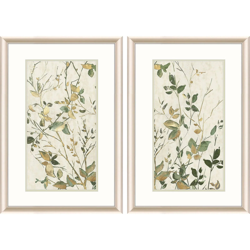 The Golden Green Branches Set With Glass Front Elegance adds an artistic touch to any room. This set includes two framed botanical prints, each showcasing leaves in rich shades of green and gold, delicately set against a light background. The prints are double matted in white and pale laurel, enhancing their vibrant colors and adding depth to the artwork. The frames boast an angled profile moulding in a champagne gold finish, which complements the artwork beautifully and adds a touch of sophistication to your decor.