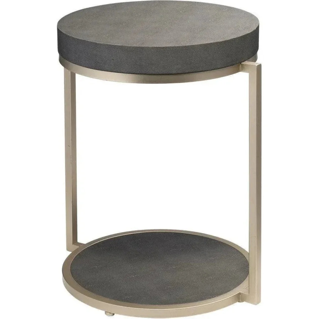 Grey Leather Round Mid Century Modern Side Table With Shelf Features: