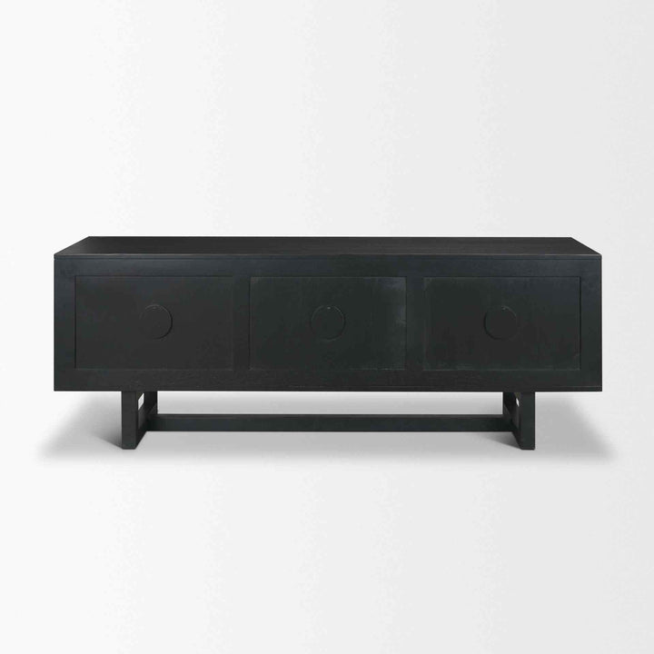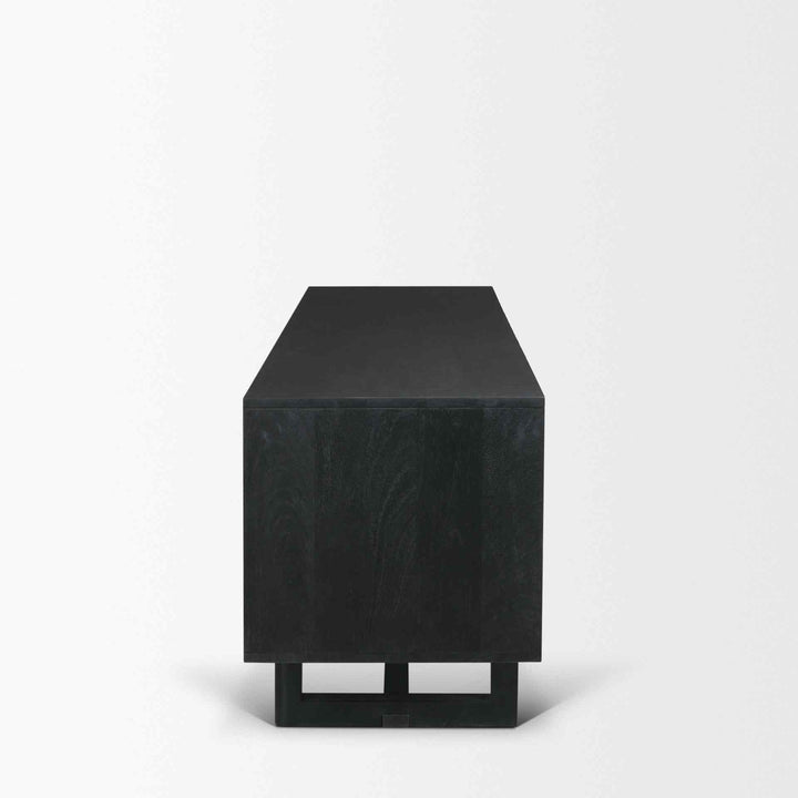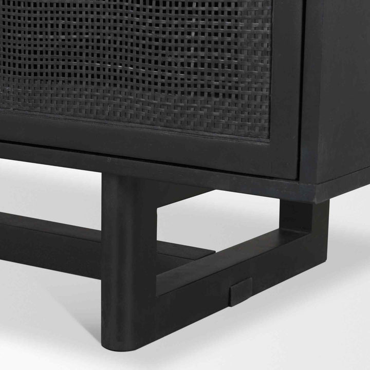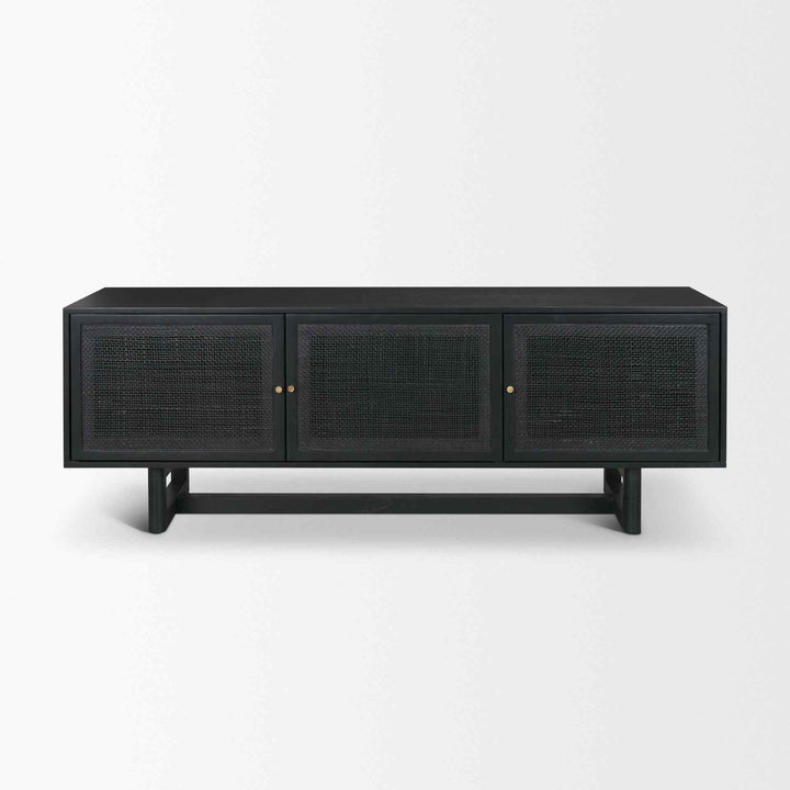 Offering a blend of modern and organic style, this media console is crafted from matte black wood and natural cane. It brings a relaxed yet stylish look to any entertainment space, thanks to its smooth finish. The combination of solid wood and natural cane creates a unique texture that stands out. Its sleek brass knobs add a touch of elegance. With plenty of storage space, it is perfect for organizing media essentials. This piece is not just functional; it also serves as a decorative element, making it a great addition to any room. Elevate your home decor with this versatile console.