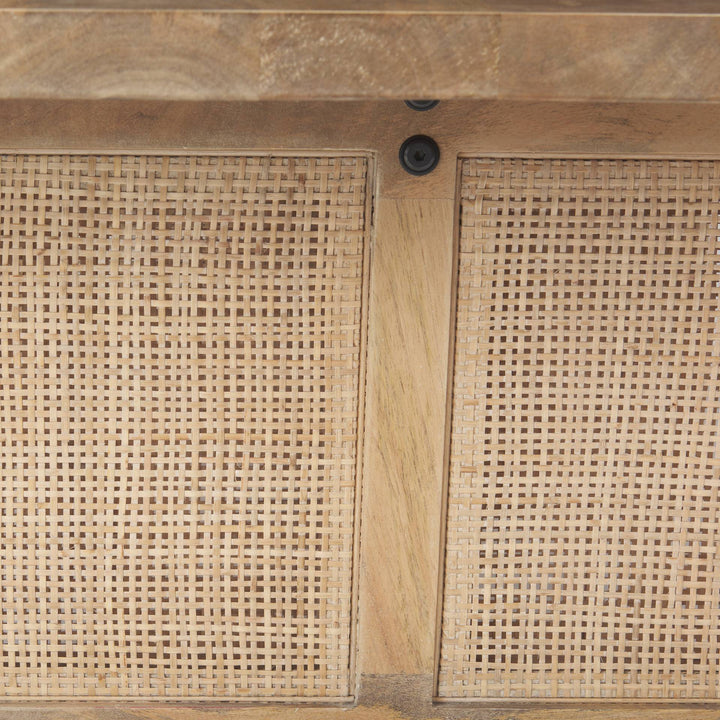 Sleek and stylish, this coffee table is crafted from solid Mango wood and features classic cane details, adding a touch of relaxed sophistication to contemporary living spaces. Its natural wood color and sturdy base make it a perfect anchor piece in living rooms, great rooms, or office spaces. The table offers a beautiful surface to display objects, trays, and accessories, effortlessly blending with other pieces in the Grier Collection.