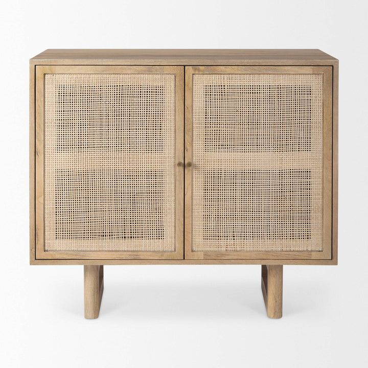 The Grier Two Doors Wood Accent Cabinet is crafted from solid mango wood, radiating a light brown finish that showcases its natural grain. This cabinet features two doors with a latticed cane front, adding a touch of texture and style to its design. The brushed gold grips provide an elegant contrast, while the unique legs enhance its silhouette. This cabinet is not only aesthetically pleasing but also practical, offering two spacious shelves for ample storage. It is designed to fit seamlessly into entryways, living rooms, bedrooms, or bathrooms, making it a versatile addition to any home.