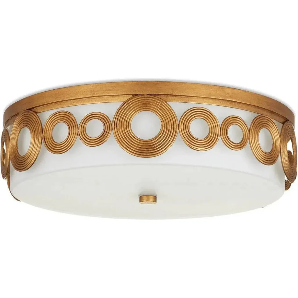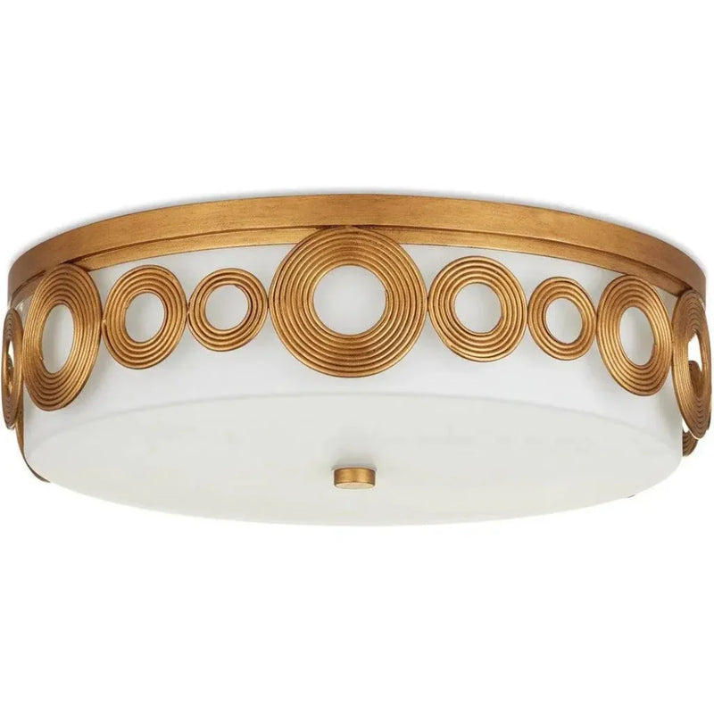 Inspired by a piece of Indian jewelry, the pattern flowing along the outer edge of the Gyges Flush Mount is designed to ornament like a necklace would a person. The decorative elements, frame, and finial are made of brass-finished wrought iron, surrounding the opaque white glass shade with warmth. The dense opacity of the shade creates a beautifully uniform glow when the lights are switched on, making this gold flush mount radiant.