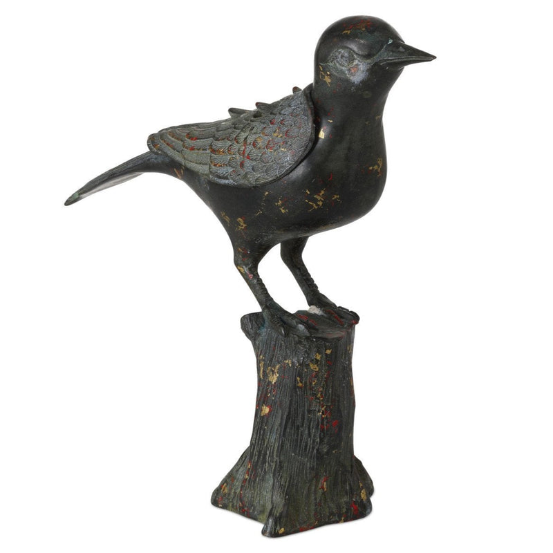 This bird sculpture is a beautiful piece of art, inspired by the Han Dynasty era. Made from bronze, it stands nine inches tall and features a detailed feather design. The sculpture captures the graceful form of a bird perched on a tree stump, showcasing timeless artistry. The dark bronze color and metallic texture add to its charm, making it a stunning decorative piece for any room.