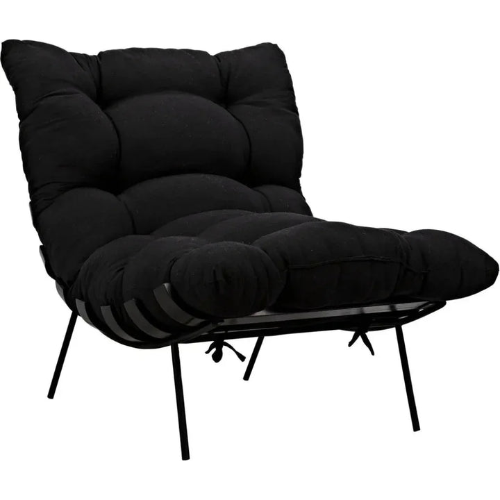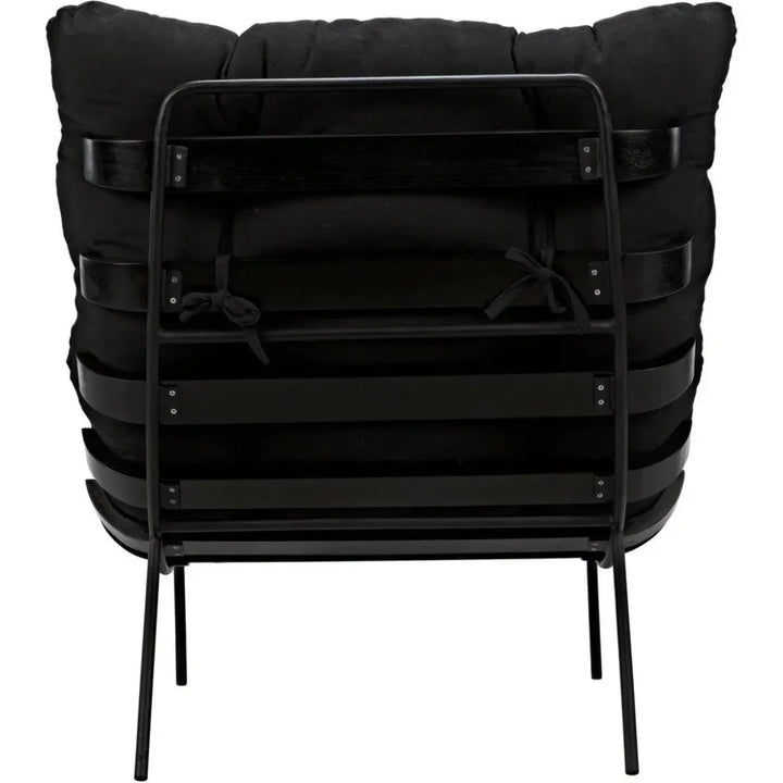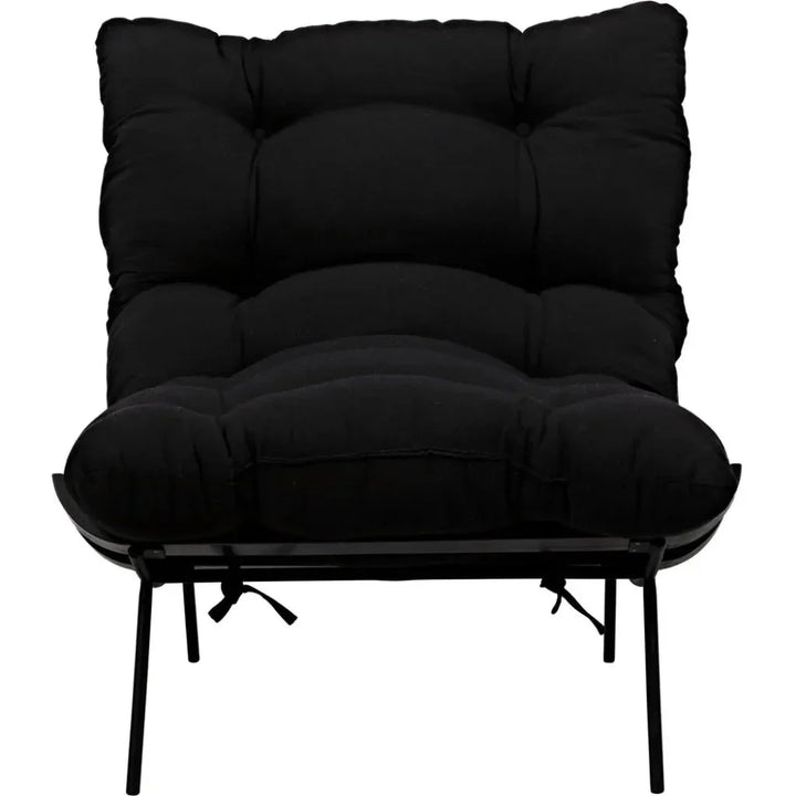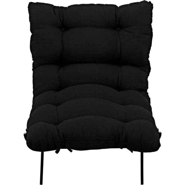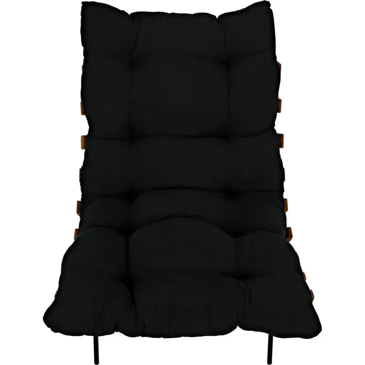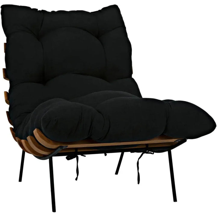 The Hanzo Chair offers a perfect combination of modern style and lasting comfort. Featuring a wide-set design and sturdy steel legs, it comes in two striking variations: one with a Charcoal Black finish and a soft black cotton cushion set on a black metal frame, and the other crafted from high-quality teak wood paired with black cotton upholstery. Both versions transform any space into a modern sanctuary with their sleek silhouettes and plush foam-filled cushions, designed for maximum relaxation and visual appeal.
