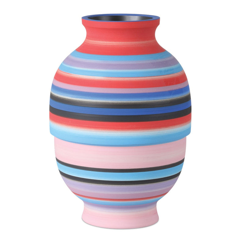 The Happy 80's Small Bright Blue & Red Vase captures the playful spirit of the 1980s with a modern twist. The hand-thrown porcelain vase features unique striations of brilliant blue and lively red that were skillfully applied while the vase was spinning on the potter's wheel. The resulting patterns highlight the artisanal craftsmanship behind each piece, as painting lines of color so uniformly while the vases are spinning is a painstaking process. Due to the artisanal painting, the surface of each accessory could differ slightly.