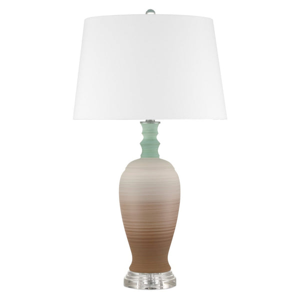 Bring a touch of nostalgia to your space with the Happy 80's Table Lamp With Retro Charm. This lamp features a playful retro vibe that adds a unique character to any room. The lamp's body showcases a beautiful mix of earthy brown and pale blue, achieved through a special technique while spinning on the potter's wheel. This results in a layered pattern that adds depth and personality to the design. The classic hourglass shape of the base adds an elegant touch, making it a perfect fit for both modern and traditional spaces.