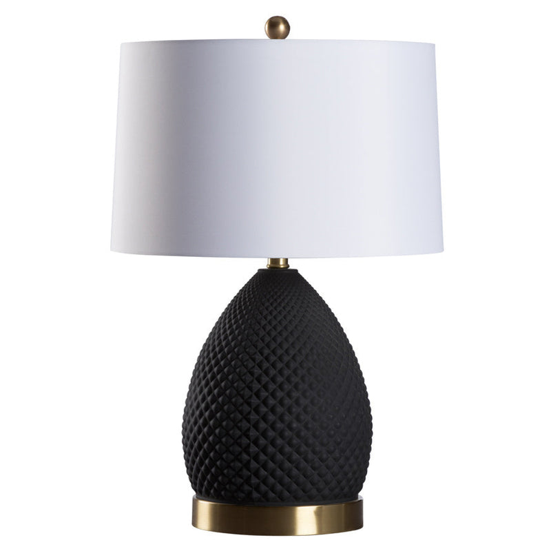 The Hester Lamp offers a stylish touch to any room with its textured black ceramic base and gold accents. The antique brass base adds a classic feel, while the white drum shade gives a modern look. Perfect for a bedside or workspace, this lamp brings both style and function with its built-in USB port. The design is bold yet elegant, making it a versatile piece that fits well in various settings. With a single bulb providing ample light, it strikes the right balance between aesthetics and practicality. The lamp is designed to be both eye-catching and useful, enhancing any decor.