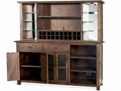 This 80x80" Buffet With Hatch Wine Rack for Wine Fridge Dark Stain is a timeless and reliable addition to your rustic, farmhouse, or cabin interior. Made from Mahogany solids and veneers with a dark finish, it features cord management, adjustable shelves, and wine storage for 20 bottles. The hand distressing and light kit add character and charm. Assembly is required.