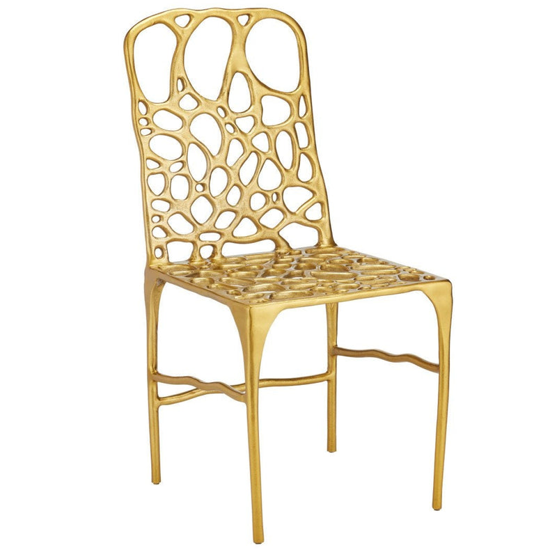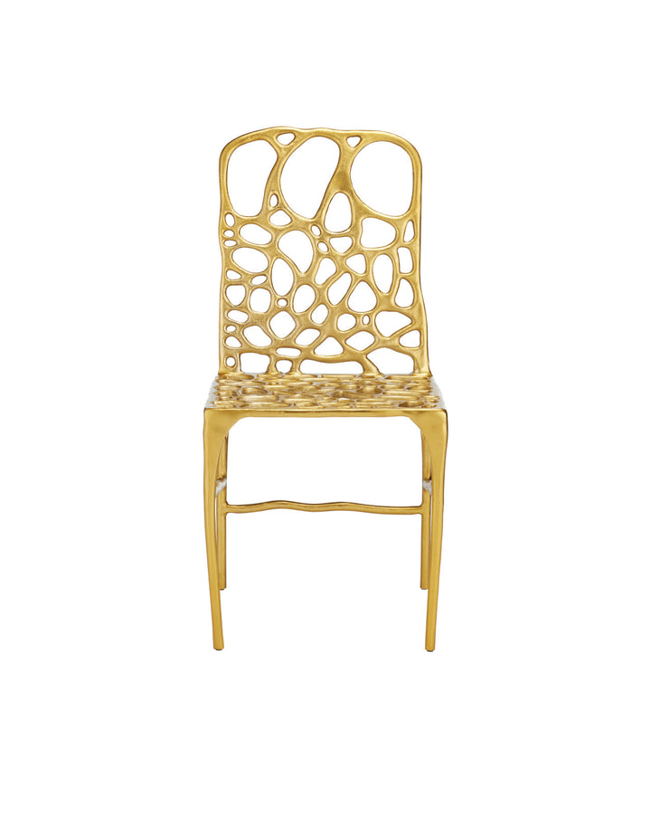 The Honeycomb Gold Side Chair is a blend of art and modern design, crafted by Marjorie Skouras. This chair is made from sturdy cast aluminum and features a radiant gold finish that captures attention. Its design draws inspiration from surrealism, showcasing an airy honeycomb pattern that is both artistic and functional. The open design gives the chair a light, elegant feel, making it a perfect addition to any contemporary space.