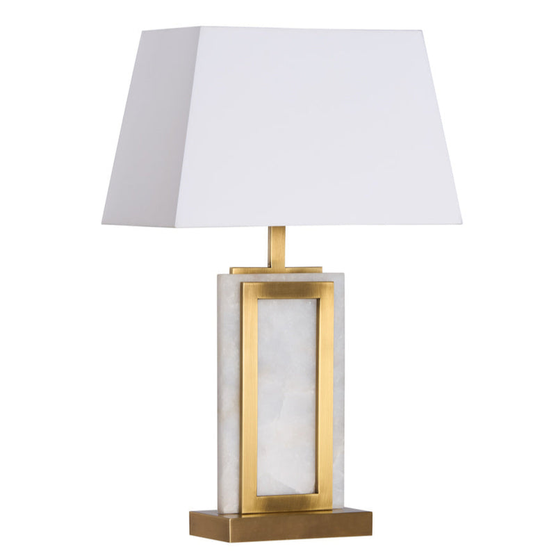 The Hopewell Lamp brings a touch of refined elegance to any space with its luminous alabaster body and warm antique brass frame. Its geometric design strikes a perfect balance between classic and contemporary styles, making it a versatile piece for both sophisticated and modern interiors. The crisp white tapered shade emits a soft, inviting glow that enhances any room's ambiance. This lamp is perfect as a timeless accent in living rooms, bedrooms, or office spaces. Its durable materials and thoughtful design make it a lasting addition to your home decor, providing both beauty and functionality.