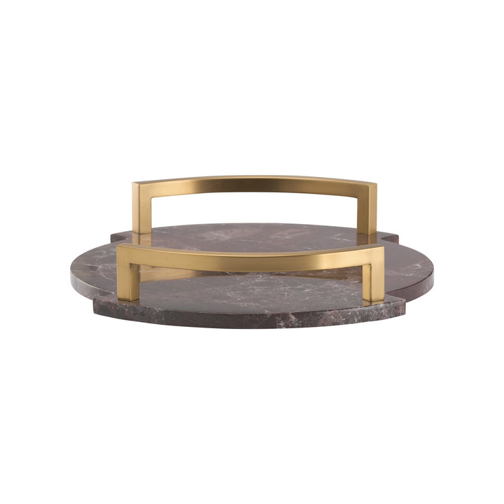 The Hopkins Tray is a stylish addition to any home. Made from maroon marble with white veining, it brings a sense of rich elegance to your space. The sleek brass handles add a touch of modern luxury, making it easy to carry while serving guests or displaying your favorite items. Its round shape and elegant finish make it a versatile piece, suitable for any room or occasion. Whether you're hosting a dinner or simply looking to elevate your decor, this tray combines beauty with function. It’s perfect for those who appreciate timeless charm with a touch of sophistication.