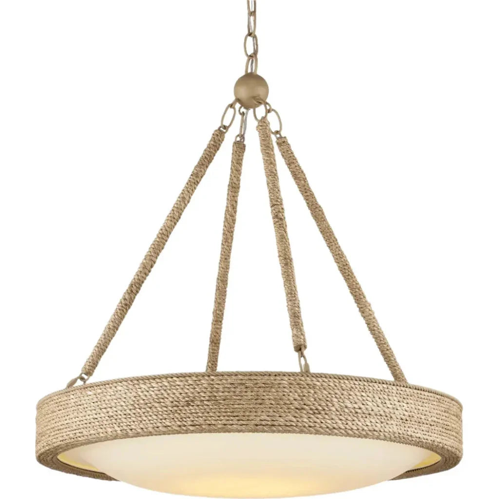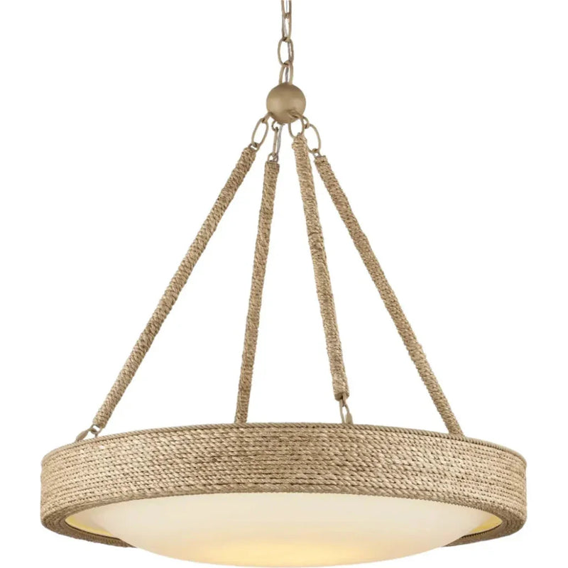 The exquisite Hopscotch Chandelier by Clarence Mallari embodies natural beauty and modern technology. With its seamless abaca rope wrapping on the frame and arms, and a frosted glass diffuser for added elegance, this chandelier is expertly crafted to perfection. Plus, the integrated LED technology offers energy efficiency and longevity. Elevate your space with this stunning piece.