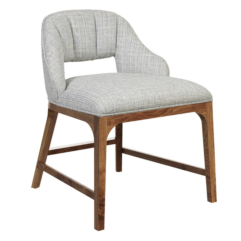 The Inga Chair covered in a Greenlight Powder fabric has an upholstered back and seat that sits nimbly atop a solid oak frame in a morel brown finish. The paleness of the fabric and the warmth of the wood bring a soft contrast to the slipper chair that is the prefect size to slide under a dressing table or a desk.