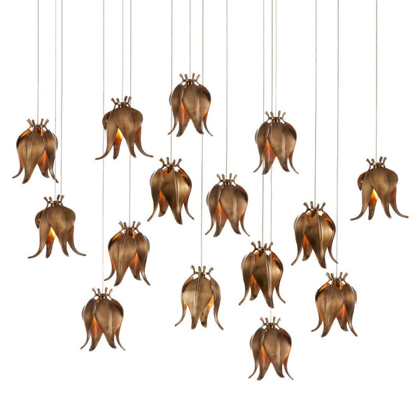 The Iota Rectangular 15-Light Multi-Drop Pendant has shades that exude the beauty of flower buds, though they are not made of plant matter as their lovely profiles would suggest; they are fashioned from brass in a warm antique brass finish. A particular design detail of note is the delicacy and positioning of the petals. The canopy of this piece is luminous in a painted silver finish. This fixture is among Currey & Company's multi-drop pendant collection, which includes multiple configurations.
