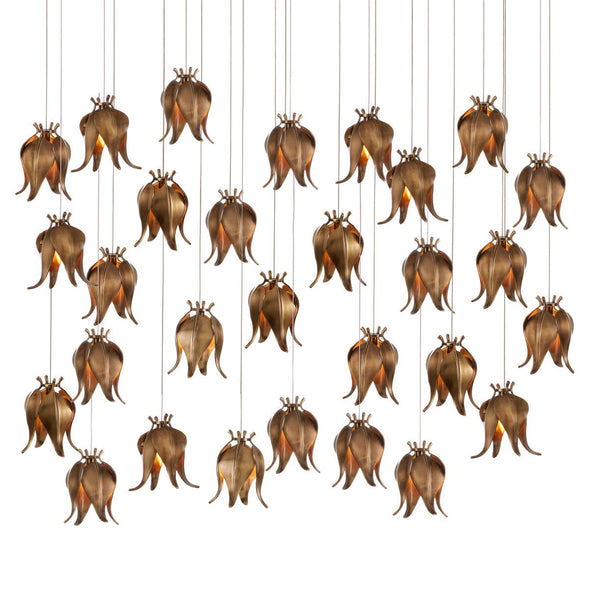 The Iota 30-Light Multi-Drop Pendant has shades that exude the beauty of flower buds, though they are not made of plant matter as their lovely profiles would suggest; they are fashioned from brass in a warm antique brass finish. A particular design detail of note is the delicacy and positioning of the petals. The canopy of this piece is luminous in a painted silver finish. This fixture is among Currey & Company's multi-drop pendant collection, which includes multiple configurations.