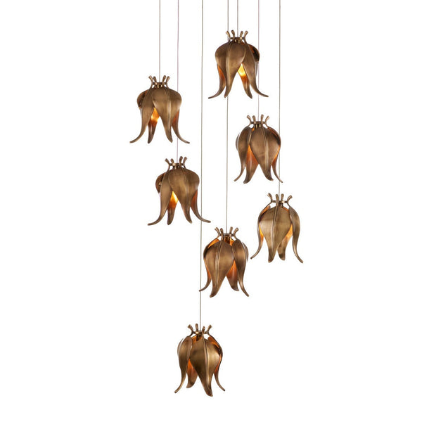 The Iota Round 7-Light Multi-Drop Pendant has shades that exude the beauty of flower buds, though they are not made of plant matter as their lovely profiles would suggest; they are fashioned from brass in a warm antique brass finish. A particular design detail of note is the delicacy and positioning of the petals. The canopy of this piece is luminous in a painted silver finish. This fixture is among Currey & Company's multi-drop pendant collection, which includes multiple configurations.