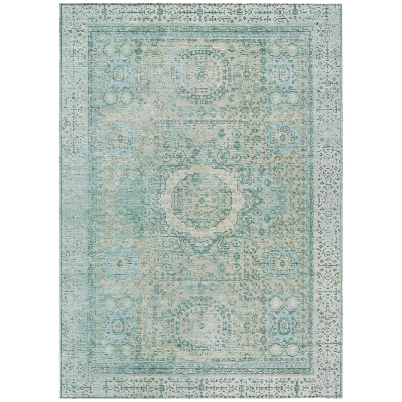 The Irias Teal Washable Rug is an elegant choice for any indoor or outdoor setting. Its distressed medallion design, complemented by a detailed border, exudes a vintage charm that enriches any space with warmth and character. The aged look of the medallions enhances their beauty, while the structured border brings a sophisticated and timeless appeal. Crafted with a traditional style, this rug is a perfect blend of classic aesthetics and modern functionality, making it suitable for a variety of decor styles.