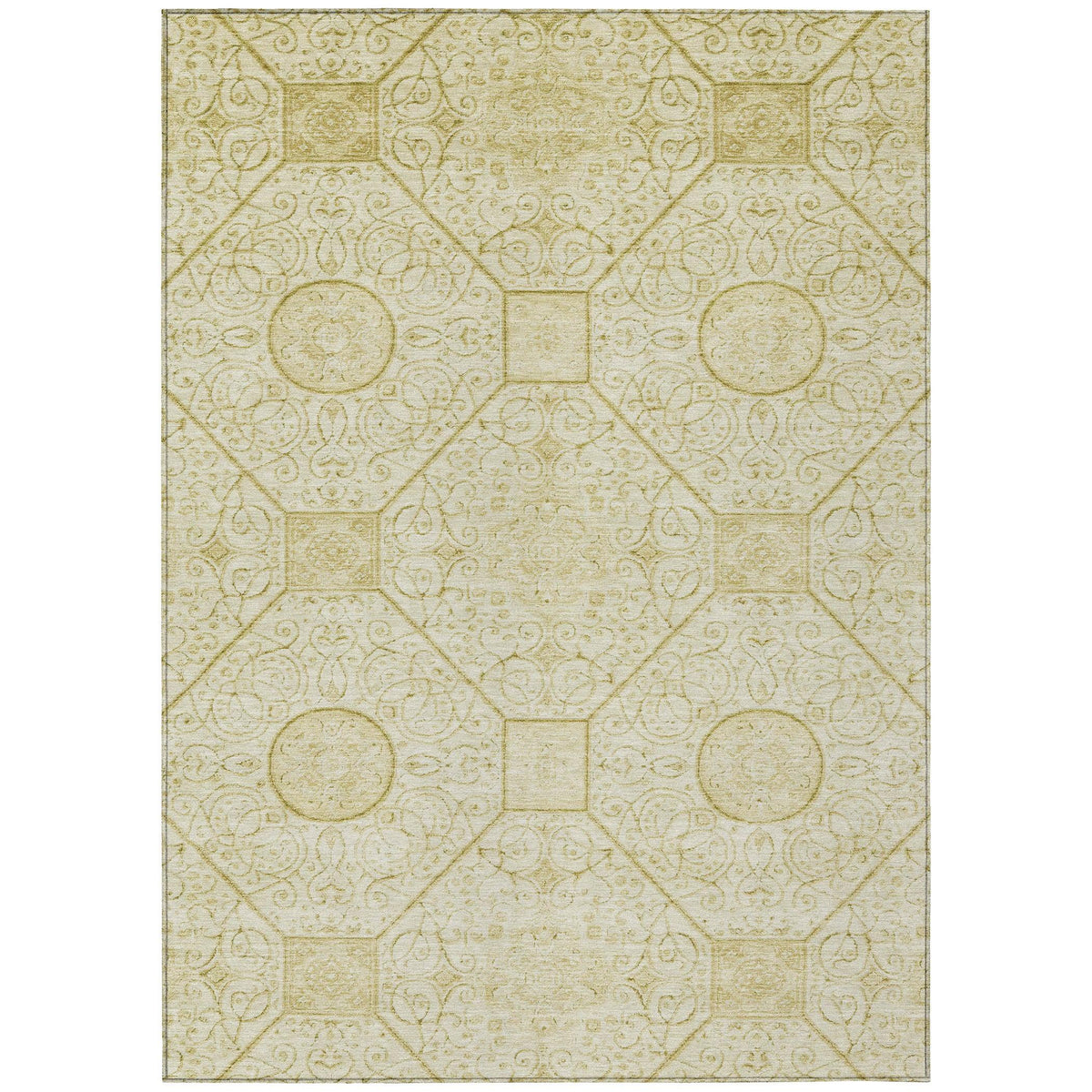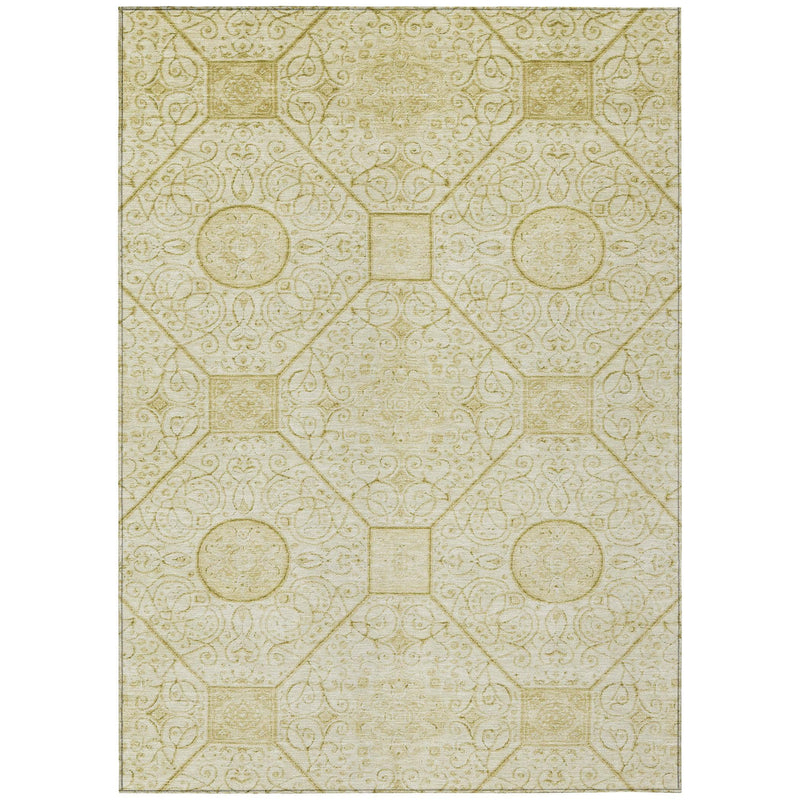 The Iriora Gold Washable Rug brings elegance and versatility to any space with its dynamic geometric pattern. Featuring a series of diamonds, squares, and circles, this rug combines bold shapes with delicate curves to add a unique texture and visual appeal. Its transitional style seamlessly fits into both modern and traditional settings, making it a versatile addition to any home. Crafted from durable polyester, this rug is designed for both indoor and outdoor use, offering UV stabilization to protect against fading, ensuring it remains vibrant even in spaces with sunlight exposure.