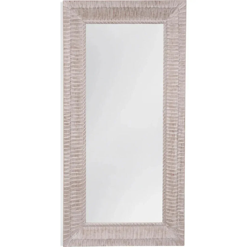 Jenelle Leaner Mirror frame has a wide carved molding profile with three leaves of detailed carving in a whitewash finish. Includes anti-tipping hardware to secure to wall. It is not recommended to hang on the wall. Transform your space with the bold Janelle Leaner Mirror.