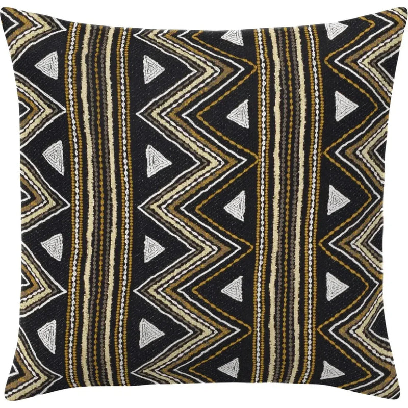 The Carbato Java fabric features a striking geometric pattern with zigzags and triangles in black, white, gold, and beige hues. This pillow is not just about looks; it includes a proprietary faux down insert that provides plush comfort. The pillow is designed to withstand the elements with solution-dyed fabrics that offer a 5-year fade warranty and are resistant to mold, mildew, and UV rays. This ensures the pillow maintains its vibrant look over time, even with exposure to the elements.