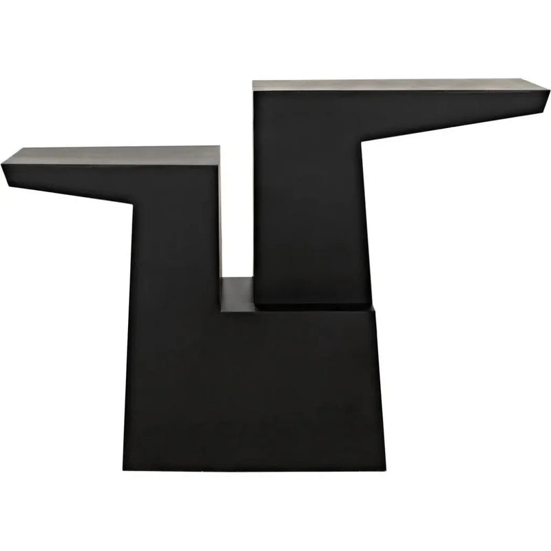 This sleek Jazz Console is expertly crafted from black steel, giving it a modern and sophisticated look. Its handcrafted design is the perfect addition to any contemporary home, providing both style and functionality. Made from durable metal, this console is built to last and elevate any space. This pared-down console is the essence of simplicity. Handcrafted of metal with a deep black finish, it is sleek, sophisticated, and very contemporary. The console is handcrafted with metal and has a sleek, sophisticated, and contemporary design. The deep black finish adds to its modern look, making it a stylish addition to any home.