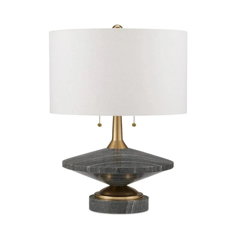 Drawing his inspiration from the mid-century modern era, Tom Caldwell designed the Jebel Table Lamp from turned stone elements with incredible personality. The aluminum details in a brushed-brass finish contribute to the warmth of this black lamp's profile, as does the beige linen shade from under which delicated pull-chains dangle. Expertly crafted with intricate stone elements, the Jebel Table Lamp brings a touch of mid-century modern design to any space. The brass finish detail adds to the inviting warmth of this stunning black lamp, while the delicate pull-chains hang from under the beige linen shade, providing ease of use and elevated style.