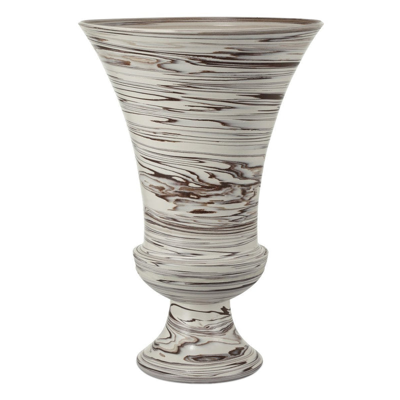 The Jejune Beige Large Footed Vase is an impressive oversized urn-shaped vessel that stands 25 inches tall. Its beige surface is adorned with swirling patterns of brown that are created during a terres mêlées production process when the two colors of clay are overlaid while the vase is spinning. This means the pattern will show on the inside and outside of the vessel, which is not watertight and is for indoor use only. Due to the artisanal treatment, the surface of each accessory could differ slightly.
