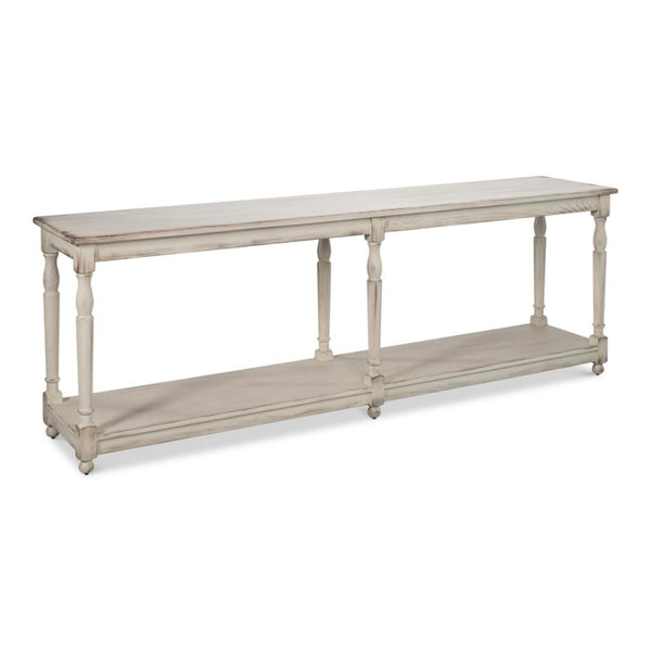The Jensen Console's 95-inch scale and solid wood construction make it ideal for luxury hospitality and residential projects requiring statement pieces. Hotel lobbies benefit from the substantial presence and open storage that accommodates guest services materials, while the off-white finish complements various design schemes. Vacation rental properties use the extra-long surface for multiple functional zones -- keys and information on one end, decorative styling in the center, and guest amenities on the opposite end. Model home staging relies on oversized consoles like this to anchor large spaces and provide the furnished feel that helps buyers envision the home's potential.
