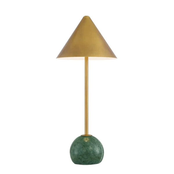 Add a touch of elegance to any room with the Journey Green & Brass Cordless Table Lamp. This stylish lamp combines a sleek, modern design with practical features. Its slender antique brass stem and gold conical shade offer a sophisticated finish, perfect for contemporary spaces. The spherical green marble base provides not only a striking contrast but also a stable foundation. Designed for indoor use, this lamp stands out in any setting, whether on a side table, desk, or bedside.