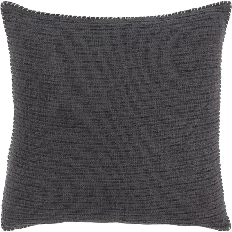 This woven pillow is a wonderful addition to any decor where a solid with personality is a great fit. The woven medium texture of this pillow shows as a stripe but still works in your decor as a solid. It is a beautiful piece alone; it's size makes it a wonderful piece for layering. The hand applied whip stitch border in natural heavy cotton thread frames beautifully the crafted appeal of this pillow. This stitch is shows as blended on the natural color and as contrast on the sister colors. The coordinating solid cotton back features a hidden zipper closure for ease of fill. Elevate any interior living space with sophistication and urbane style with this woven accent pillow from Rizzy Home. With a light texture in a unique striped pattern solid design, this elegant 22" x 22" pillow features a gorgeous whipstitch flange in natural that brings extra finesse to this design element, making it great alone or layered with other textures, colors or styles. In a refined, rich charcoal gray color, this timelessly chic pillow will bring added refinement and dimension to any decor.