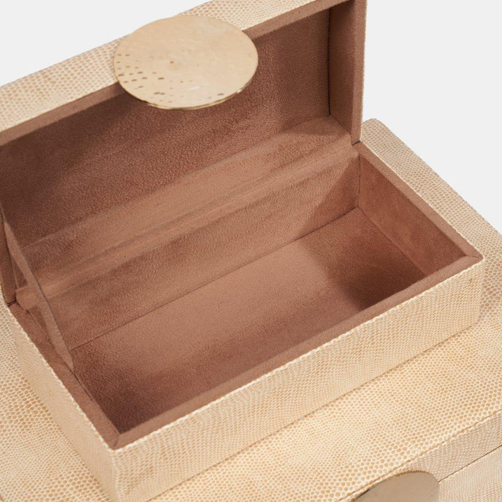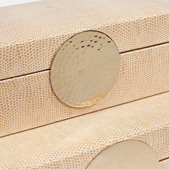 Elevate your space with the Juliana Boxes Elegant Faux Snakeskin Storage Solution. These boxes bring a touch of luxury to any room with their elegant ivory color and sophisticated faux snakeskin texture. Accented by hammered brass hardware, they offer a chic and refined look. Perfect for organizing your essentials, these storage boxes combine style and function, making them a must-have for those with a discerning eye. Whether placed on a shelf, table, or desk, they provide a tasteful storage solution that complements any decor. Crafted with quality materials, these boxes ensure durability while adding a touch of elegance to your space.