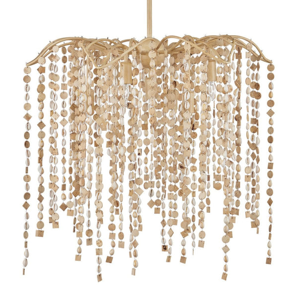 A shell chandelier uses natural seashells -- typically cowrie, capiz, or mother-of-pearl -- as the primary decorative element that surrounds and diffuses light sources. Also known as a beaded chandelier or coastal chandelier, this fixture type transforms organic oceanic materials into refined lighting that brings the warmth and movement of the sea indoors. Shell chandeliers work best in spaces where natural texture and soft light diffusion enhance relaxed, organic design aesthetics.