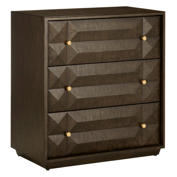 The Kendall Dove Gray Chest has a geometrically striking profile created by the interplay of peaks and valleys on its drawer-fronts. It is made of oak solids and veneers with surfaces in a dove gray finish that have been wire-brushed to accentuate the grain in the wood. The faceted dark brown chest is jewel-like, the metal pulls in a polished brass finish adding a glimmering touch to the warmth of the gem-like chest.
