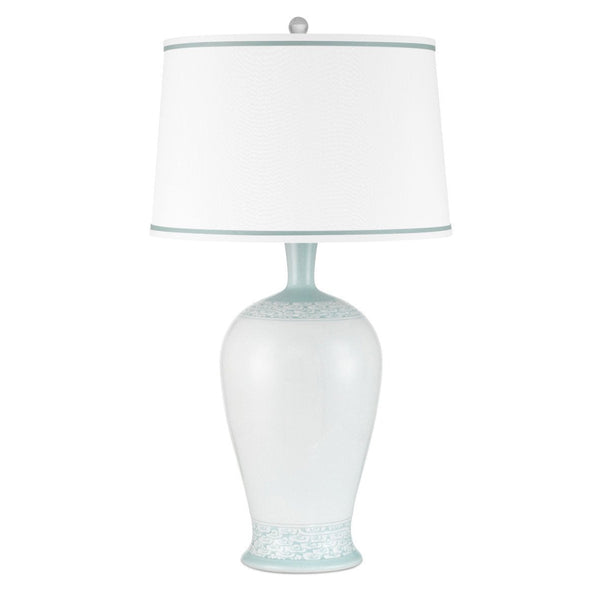The Ketty Table Lamp brings a touch of elegance to any room with its exquisite design. This lamp stands out with its vase-shaped porcelain base, showcasing beautiful pale green cloud motifs inspired by the Ming Dynasty. Its soft beige drum shade is adorned with double trim, enhancing the lamp's refined look. The polished nickel finial adds a gleaming touch, subtly elevating the lamp's aesthetic.