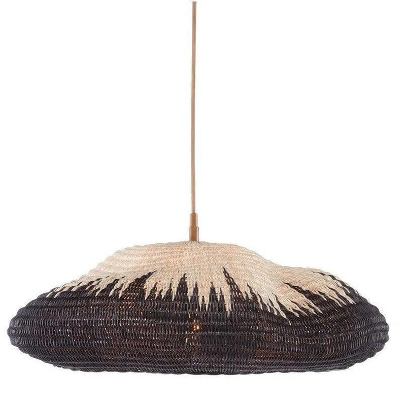 The Comme Des Paniers Pendant was inspired by wicker bags our design team saw in Paris. Panier in French means basket, the name a nod to the basket-weave it took to achieve this cloche-like shade. A detail of note is how the two-tone wicker shade looks as if there is a flame flowing up it. The wrought iron hardware on this basket-weave pendant is in a Khaki finish. Adjustable from 15.5" to 129.5" with use of included chain/rod kit/cable. If your space calls for a longer drop, additional chain/rods/cable is available for purchase.