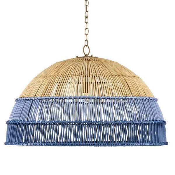 Hiroshi Koshitaka envisioned the Senjyo Pendant as one of a number of fixtures he sees as fulfilling Saisei, a concept that encompasses the acts involved in regeneration and reproduction as we restore, revive, and experience regrowth and rebirth. Rattan is woven around a wrought iron frame, the top of the dome in a khaki finish graduating to rings of Bluebonnet and Cornflower blue finishes. With this tan and blue pendant, Koshitaka stays true to exploring his fascination with the Color Field tradition of the 1940s. Adjustable from 29" to 97" with use of included chain/rod kit/cable. If your space calls for a longer drop, additional chain/rods/cable is available for purchase.