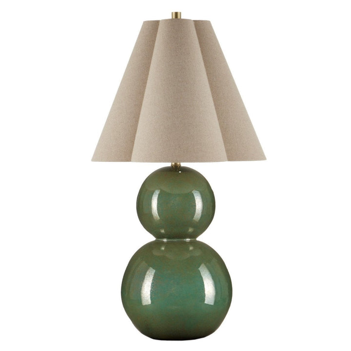 The Kindred Table Lamp is more than just a light source; it's a piece of art for your home. Its unique double stacked-orb shape is made from ceramic with a rich, dark green glaze that creates a beautiful mottled look. The glossy finish gives it a bright, eye-catching glow. Standing at 34.5 inches tall, this lamp is perfectly sized to be a standout accent piece in any room. The clover-shaped shade adds an unexpected charm, tapering upward to give the design a touch of elegance.