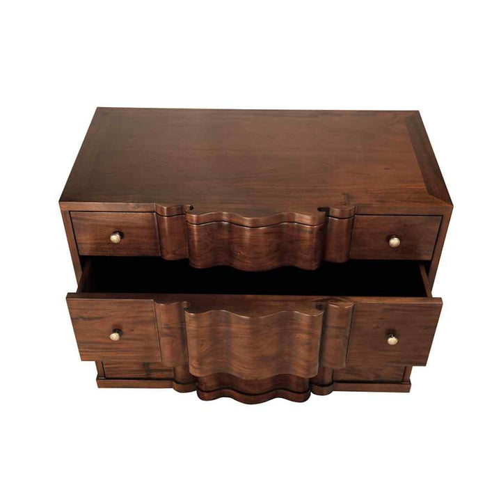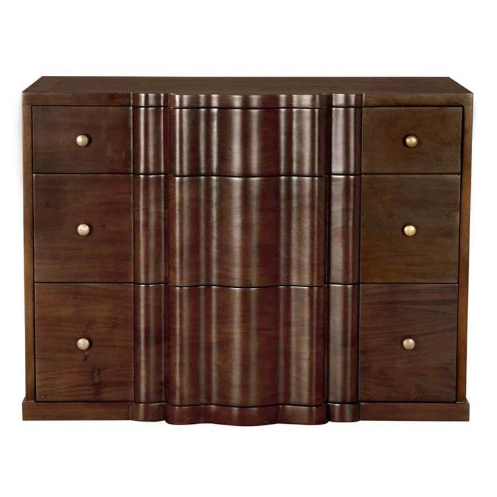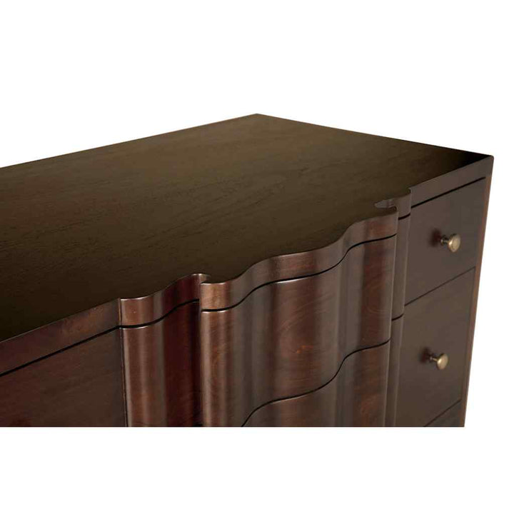 The Kiss Dresser offers a perfect blend of style and function. Crafted from rich mahogany with a hand-rubbed brown finish, it exudes warmth and elegance. Its brass pulls add a subtle shine that complements the dresser's clean lines. This piece fits seamlessly into both classic and modern settings, enhancing any room's decor. The sturdy construction ensures longevity, while the spacious drawers provide ample storage for clothing and essentials. Its timeless design and practical features make it a valuable addition to any home, combining beauty with utility in a way that is both appealing and functional.