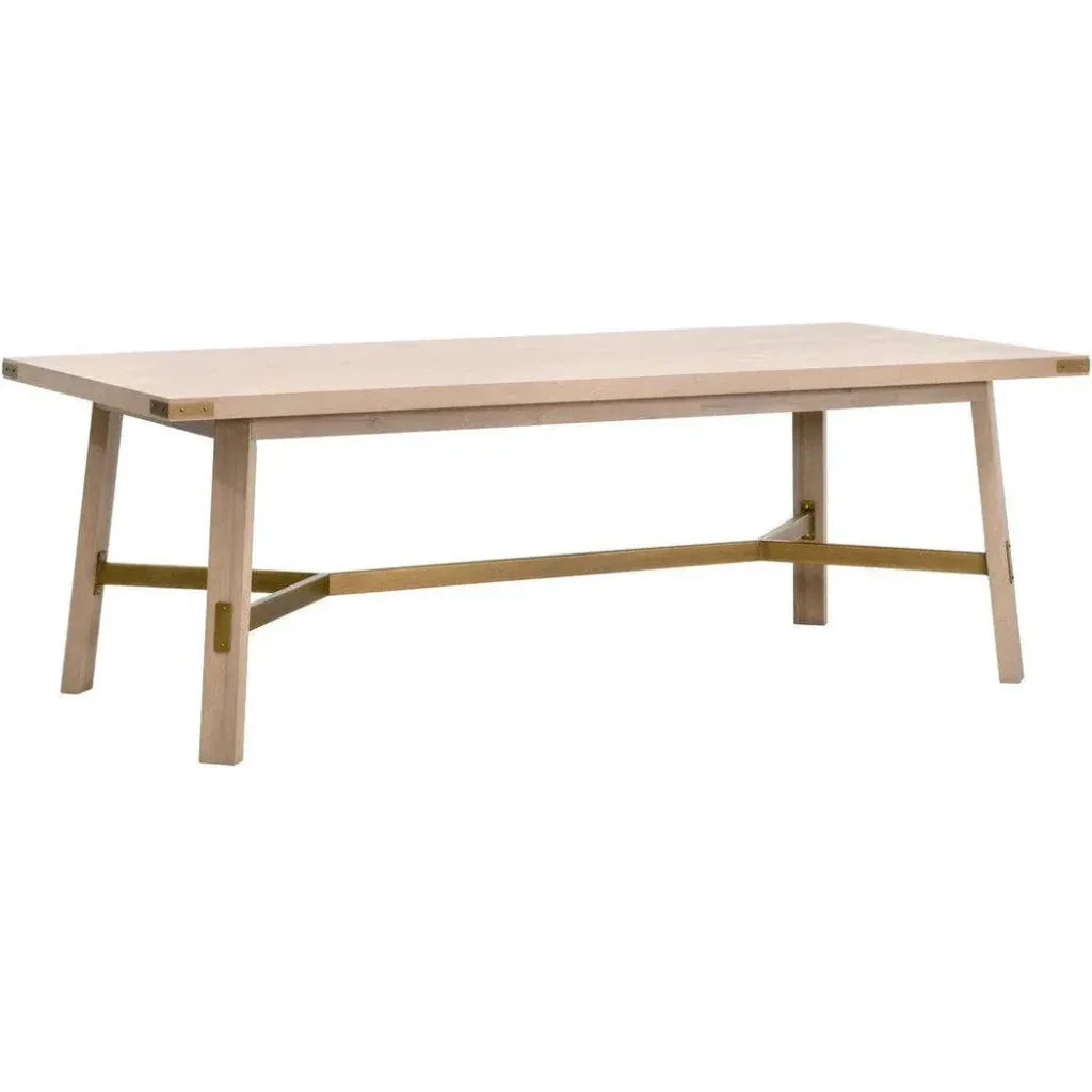 Elevate your dining experience with the magnificent Klien Dining Table from Essentials for Living. Its enduring oak veneer wood, exuding a charming light honey tone and warm brown wood grain, exudes timeless beauty. Enhanced by luxurious brushed gold brackets and a leg stretcher base, this table adds a touch of grandeur to any dining area. Its sturdy metal construction and unique design make it both durable and visually stunning. Combining elements of farmhouse, traditional and modern styles, this table is a perfect fit for any setting. With generous measurements of 90.25" wide, 40.75" deep, and 29.75" high, it comfortably seats up to 8 guests. Make a statement with the exquisite Klien Dining Table by Essentials for Living.