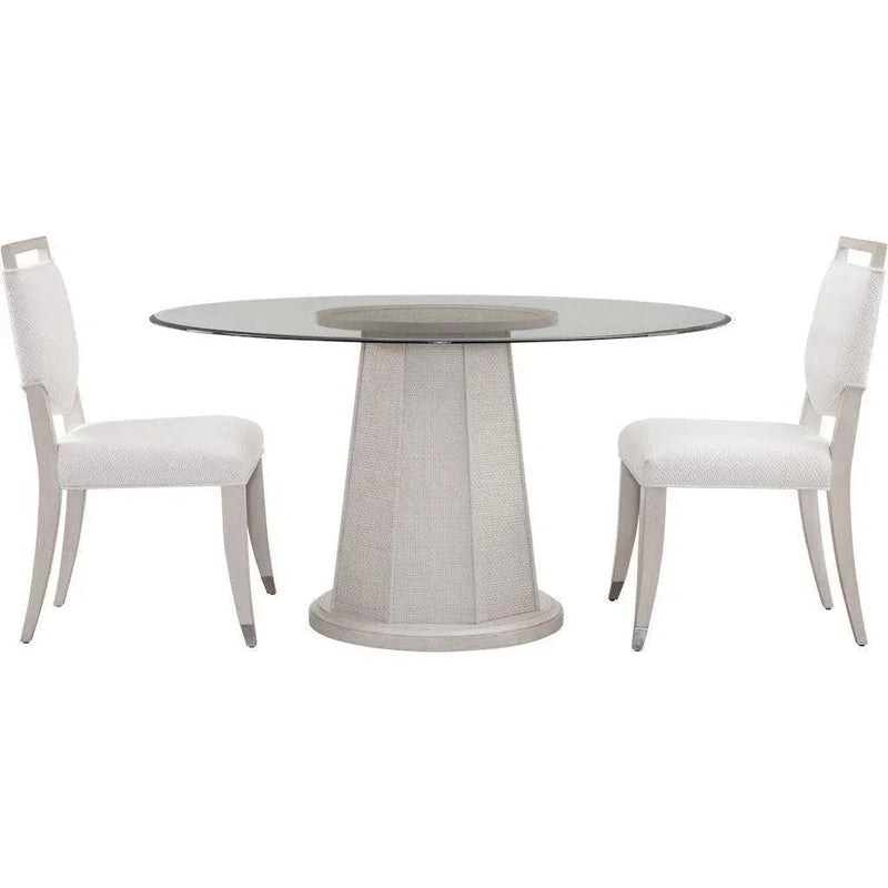 Its exquisitely tapered pedestal base and intricately woven cane detailing, accented by a luxurious white-wash on mindi veneers, convey a sense of sophistication. This versatile table features a 48" round glass top, providing ample space for 4 adults to comfortably dine. Elevate your dining experience with this elegant and long-lasting addition to your home.