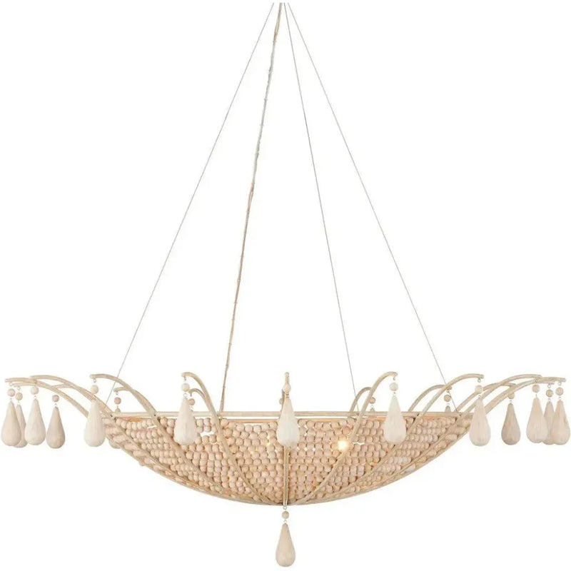 Elevate your space with the Korg Chandelier from the Barry Goralnick Collection. Meticulously handcrafted with exquisite wooden beads and pendants, delicately strung along a wrought iron frame coated in a Sandstone finish, this enchanting chandelier exudes a refined coastal or international aesthetic.