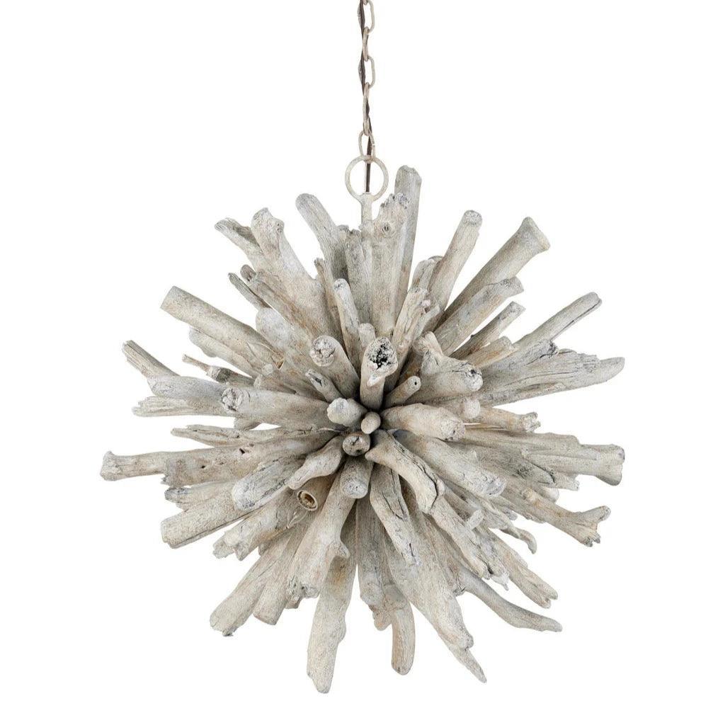 The Kuka Pendant, a creation by Marjorie Skouras, combines the beauty of nature with elegant design through a whitewashed driftwood finish. Its intricate driftwood starburst and tumbled wood pieces form a breathtaking work of art, ideal for coastal and lakeside settings. Elevate your space with this one-of-a-kind pendant. The Kuka Pendant, in a whitewashed driftwood finish with a delicate driftwood starburst design, was thoughtfully designed by Marjorie Skouras to honor her beloved Yucatan Peninsula.